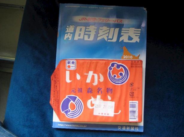 森の名物が「いかめし」。弁当の大きさは、前日買ったA5版の道内時刻表の半分イカ。