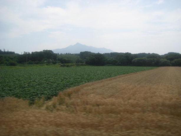 ビート畑、ビール麦(二条オオムギ)畑、中央に斜里岳。標高1,545m、日本百名山のひとつ。