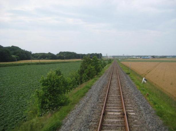 知床斜里駅を過ぎると線路はずっと真っ直ぐ。車両の最後尾から撮った写真。