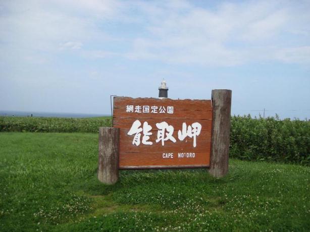 看板の向こうに能取岬灯台が見える。今も現役のようだ。