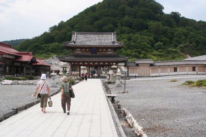 観光物産館「まさかり」でホタテラーメンを食べ恐山へ。イオウの臭いが立ち込める。