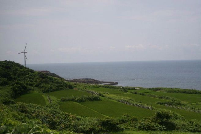 横磯駅を過ぎて車窓から撮影。海岸線の脇で田んぼをやっている。風力発電も。